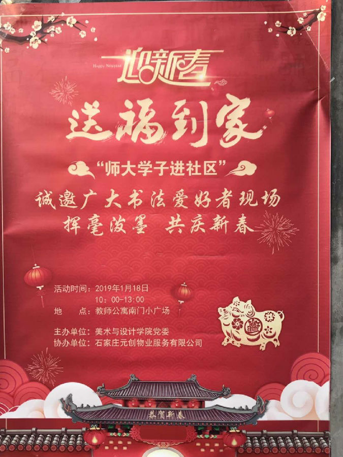 2019年1月18日,黄色仓库 党委组织学院书法专业学生在师大教师公寓举办“写春联 送祝福”活动,为公寓的教职工与家属送上新春祝福。